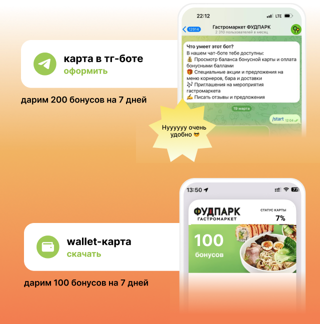 За оформление wallet-карты дарим 100 бонусов на 7 дней. За оформление карты в ТГ-боте дарим 200 бонусов на 7 дней. Бонусная карта становится активной с момента заполнения анкеты.